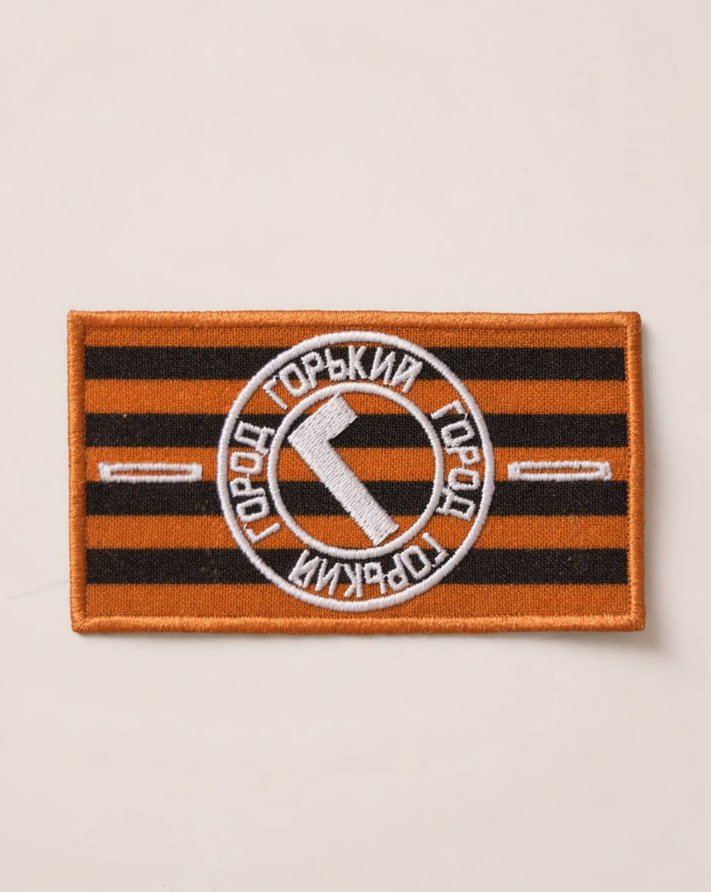 Патч выполнен в форме нашивки с креплением на пуговицах — вы легко зафиксируете его на одежде и при необходимости снимете без повреждения ткани. Основой дизайна стала георгиевская лента, на фоне которой размещено фирменное лого бренда «Город Горький». Лаконичное, но выразительное сочетание патриотической символики и уличной эстетики.